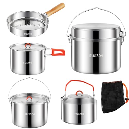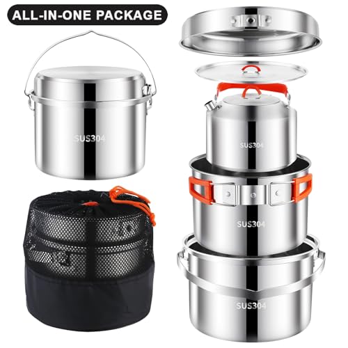 Camping Cookware Set,Camping Cooking Set,304 Stainless Steel Camping Pots and Pans Set,Durable Camping Gear with Kettle for Hiking Outdoor Cooking Picnics