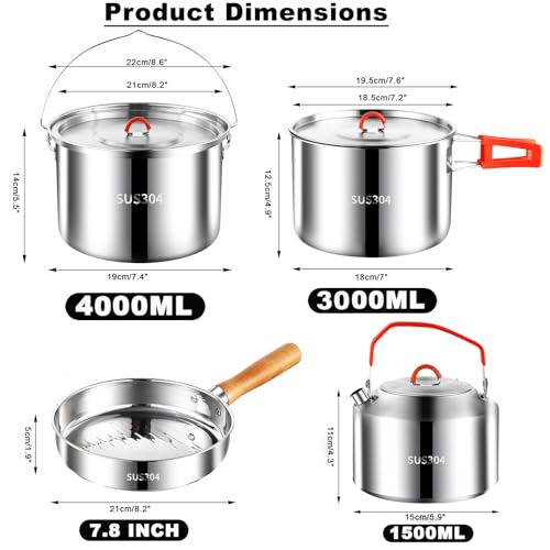 Specification: Camping Cookware Set,Camping Cooking Set,304 Stainless Steel Camping Pots and Pans Set,Durable Camping Gear with Kettle for Hiking Outdoor Cooking Picnics
