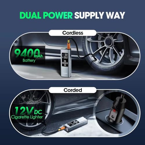 Specification: Cocosun Tire Inflator Portable Air Compressor, 2X Faster Inflation [9400mAh Battery & 12V DC Cord] Car Tire Pump with LCD Dual Display, 150PSI Electric Air Pump for Car SUV MPV RV Bike Ball,Grey