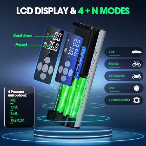 【Dual display & 4+N Smart Modes】High-definition large LCD dual display shows real-time and preset pressure value, which can also be used as a digital pressure gauge with 4 pressure unit options- PSI, KPA, BAR, KG/CM. 4 types of preset modes (bicycle, motorcycle, car, and ball) are convenient for beginners to use. The custom mode allows you to set the pressure value (3-150psi) according to the inflation object, and it is easy to operate and meet your various inflation needs.